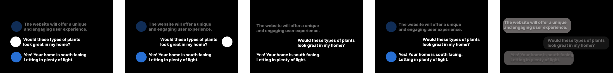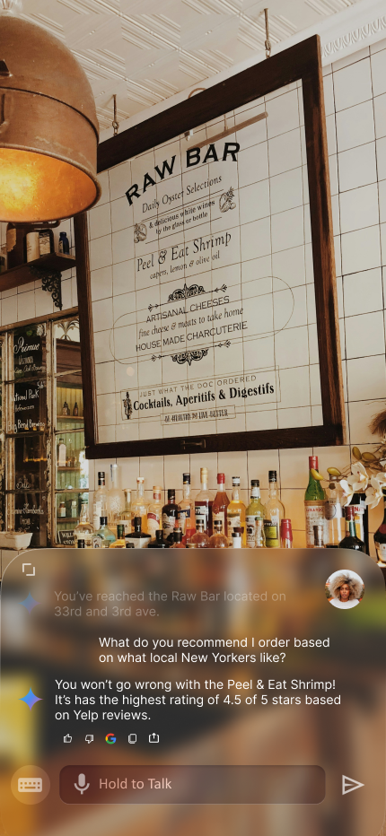 In each iteration, moving from left to right, I've experimented with increasingly transparent backgrounds. The second image explored how to integrate the background seamlessly into various environments while maintaining readability. User feedback revealed a preference for a more subtle, Gaussian blur effect, as seen in the third image. Additionally, the 'plus' button was changed to 'send' based on user curiosity and a desire to interact more directly with Astra. As development progressed, I introduced 'hold to talk' and a text option, as demonstrated in the final image, which showcases the background in a different location.