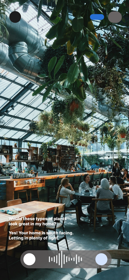 Note: needs to be button that allows for audio/camera usage and text usage. The text needs to be readable and I’ll need feedback on how users want the conversation between themselves and Astra is displayed.